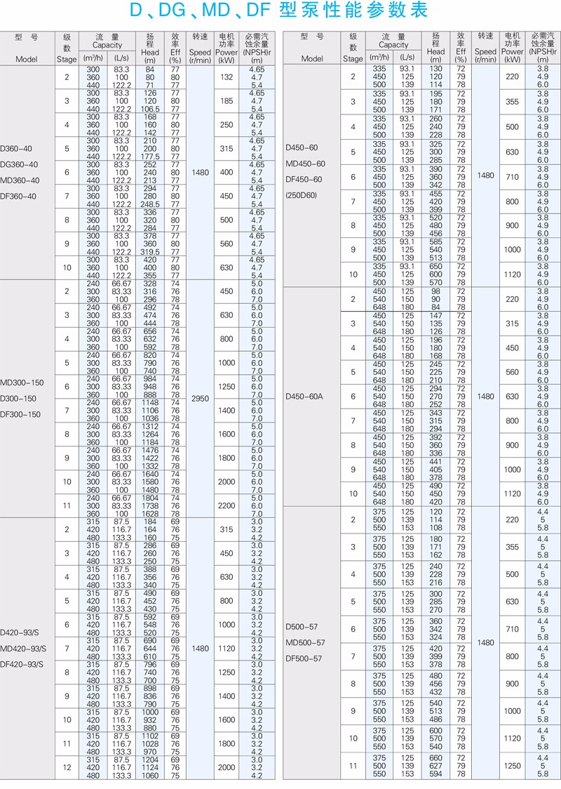 D、DG、MD、DF等系列高吸程泵為臥式安裝,吸入口水平(DG垂直向上),排出口垂直向上。泵的吸入段、中段、吐出段用拉緊螺栓聯(lián)結(jié)成一體。泵由吸入段、中段、吐出段、葉輪、軸、導(dǎo)葉、導(dǎo)葉套和平衡盤等主要零部件組成。轉(zhuǎn)子的軸向力由平衡盤平衡,軸承采用滾動軸承,用潤滑脂潤滑。軸封采用填料密封或機械密封。在密封腔中通入有一定壓力的水起水封作用。從驅(qū)動端方向看,泵為順時針方向旋轉(zhuǎn)。